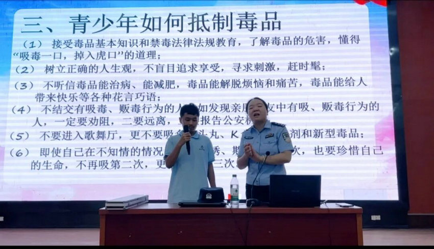 最后,葛警官仔细讲解了"拒绝毒品"这一主题。毒品,是被明确界定为能够使人形成瘾癖的麻醉药品和精神药品,其危害之大超乎想象。在讲堂上,警官们展示了仿真毒品,让同学们近距离看清毒品的真实面目,知晓它们可能会以各种隐蔽的形式出现在生活中,不能掉以轻心。接着观看禁毒动画视频,视频里呈现了毒品是如何一步步摧毁个人的身体机能、破坏家庭关系、扰乱社会秩序的,画面触目惊心。再结合展示毒品危害的图片,同学们深刻感受到了毒品的可怕。