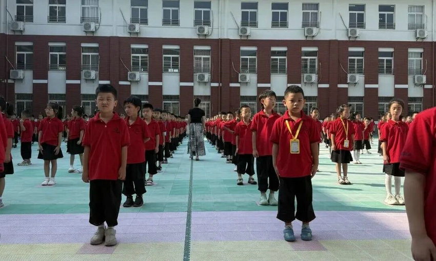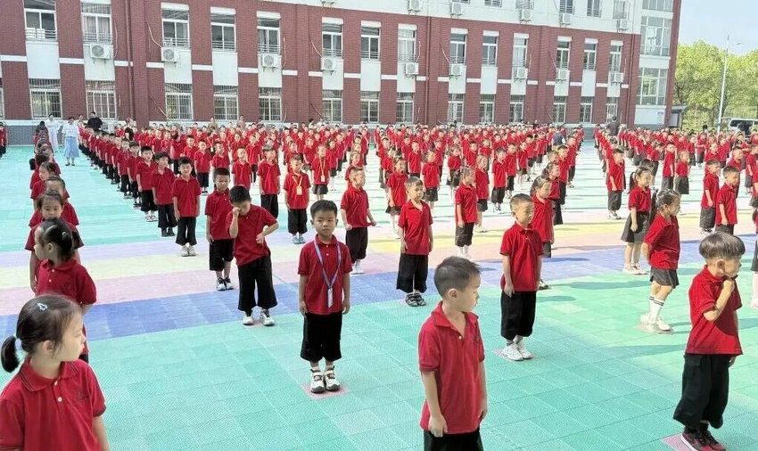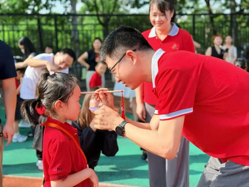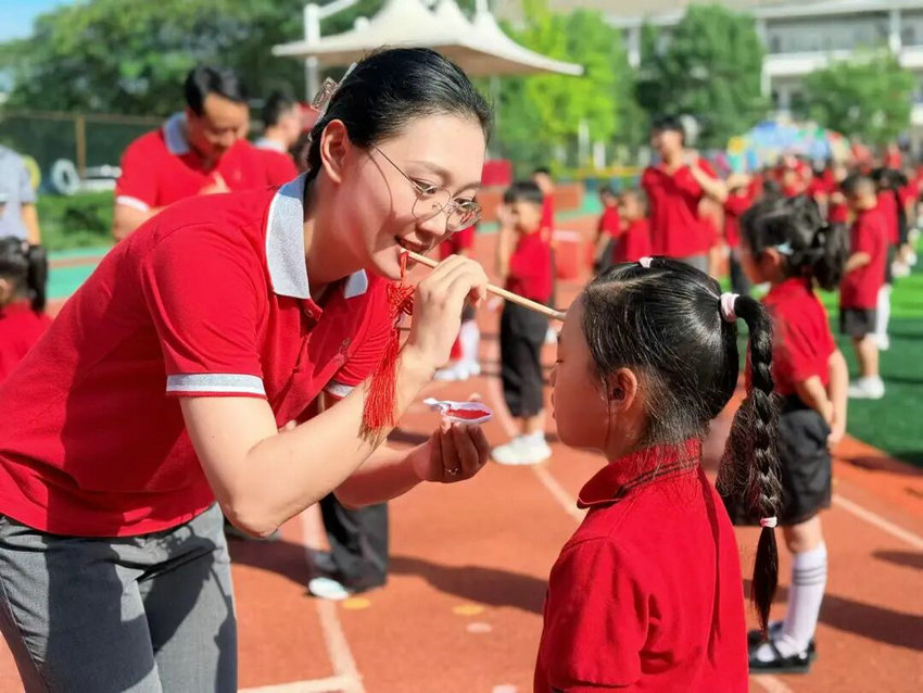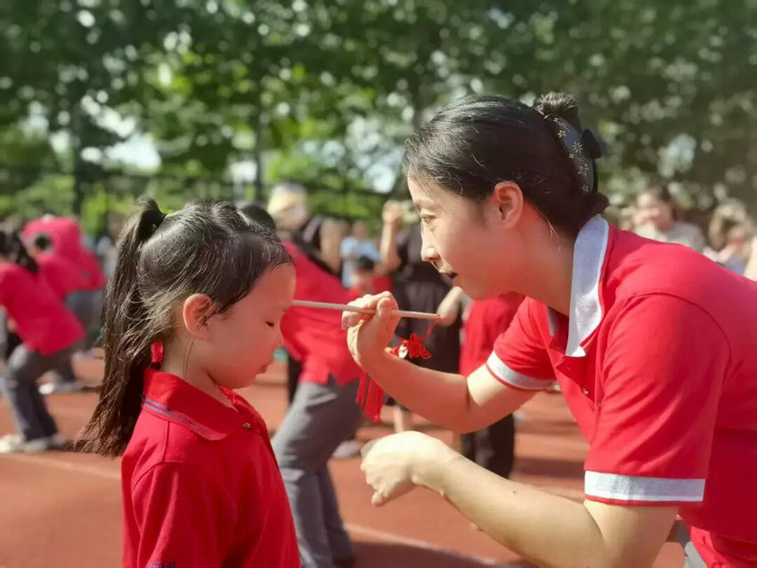 操场上,校领导及课任教师为一年级小朋友们点朱砂启智慧,其寓意着孩子从此眼明心明,好读书,读好书。愿同学们智慧相伴,顺遂喜乐。