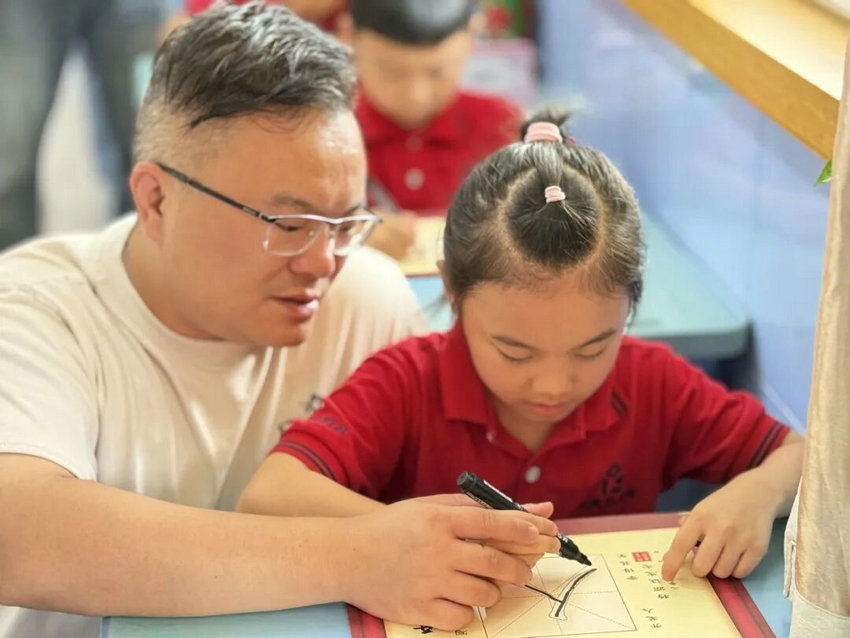 教室里,开笔启蒙,书写“人”字,一撇一捺写成人,一生一世学做人,愿同学们从此眼明心亮。