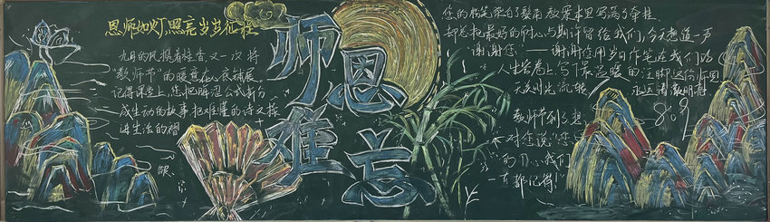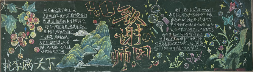 获奖班级以黑板报为载体,将对教师的感恩之情融入笔墨。有的班级用时间轴呈现“师生温暖瞬间”,记录课堂内外的点滴关怀;有的以“桃李满天下”为创意核心,绘制硕果累累的果树与师生互动场景;还有的通过“老师的一天”生动展现教师的日常,字里行间满是真诚与敬意。