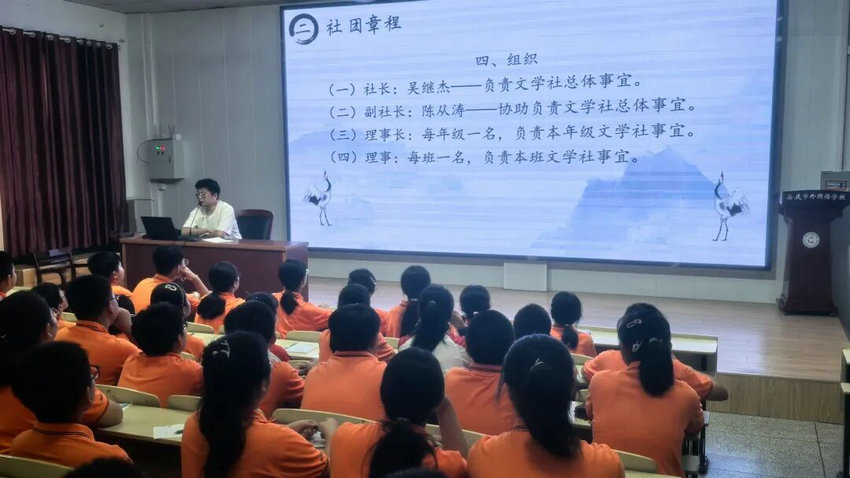 大会上,文学社现任社长吴老师向新社员介绍了社团的悠久历史、品牌活动以及“社团宗旨。随后,吴老师向新社员们介绍了社团职能,展示了历年优秀活动成功。最后在互动环节,新老社员就“我与文学”进行了轻松愉快的交流,思想的火花在此碰撞。