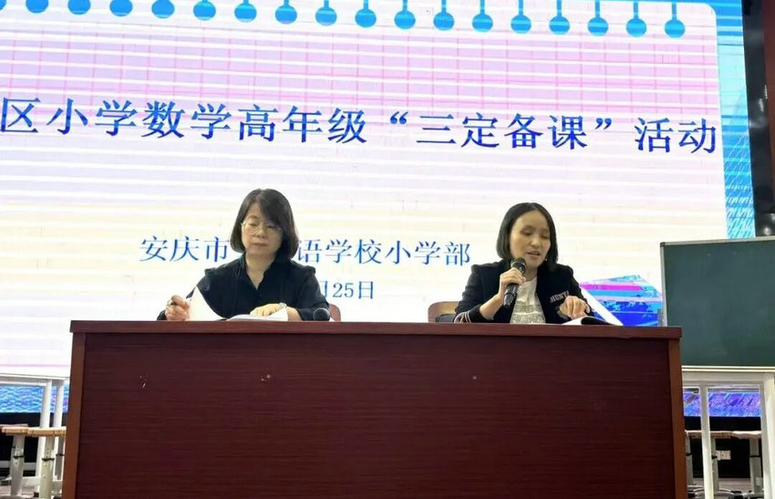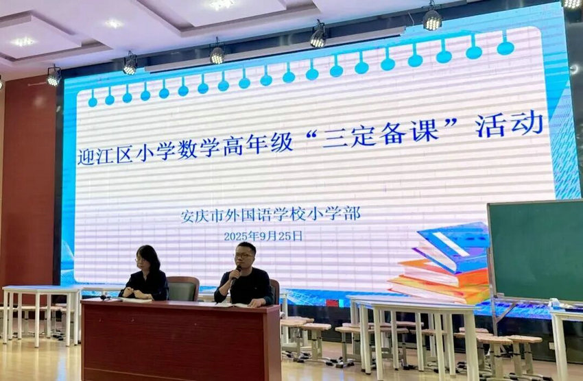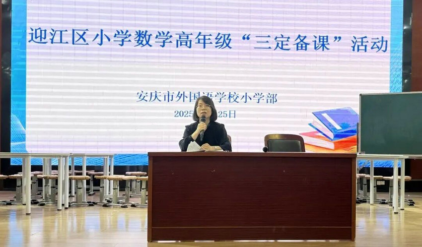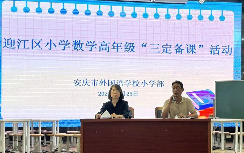 9月25日下午,迎江区小学数学高年级“三定备课”活动在我校顺利开展,来自全区各校五、六年级数学老师齐聚校报告厅,活动由外国语学校小学数学教研组长王平丰老师主持。