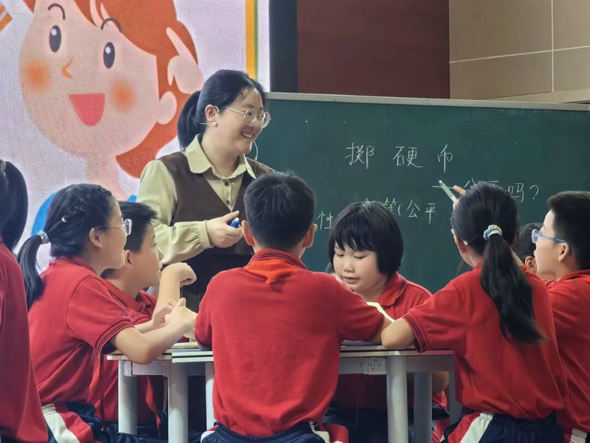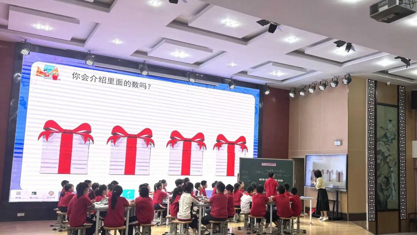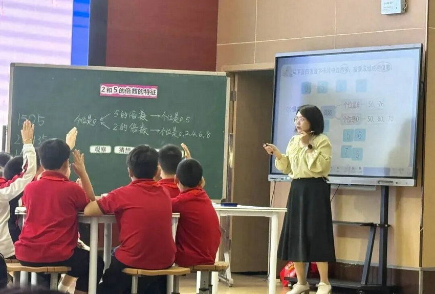 活动首先由两位老师进行课堂展示:我校何婷老师执教《可能性-谁先走》,何老师课堂“清晰”,语言、课件、教学过程均有条理,同时将“思政教育”融入数学课堂,成课堂亮点;健康路小学房莹老师执教《2和5的倍数特征》,房老师的课堂凸显“层次”,教学与练习设计兼顾学生差异,同时以智能教学赋能课堂,展现了现代技术与传统数学课堂的深度融合。