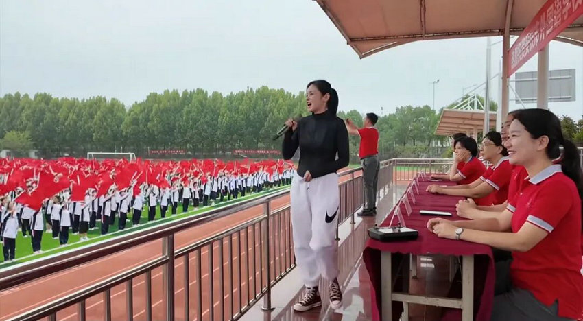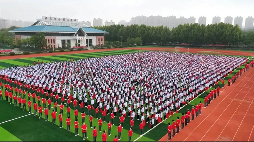 大型节目表演《请你检阅》把开幕式推向了高潮,两千多名学生组成方阵,整齐的动作、灿烂的笑容,每个人手拿着红色国旗,组成中国地图、中国、党徽、五角星、心、1949、10·1、2025、76、坦克动画、无人机动画、导弹、航天器和安外校徽等震撼字型和图案,各个画面转换自如,场面壮观!同学们以精彩的表演朝气蓬勃、热情澎湃地向国庆献礼,祝福新中国成立76周年,祝福美丽安外越办越好!