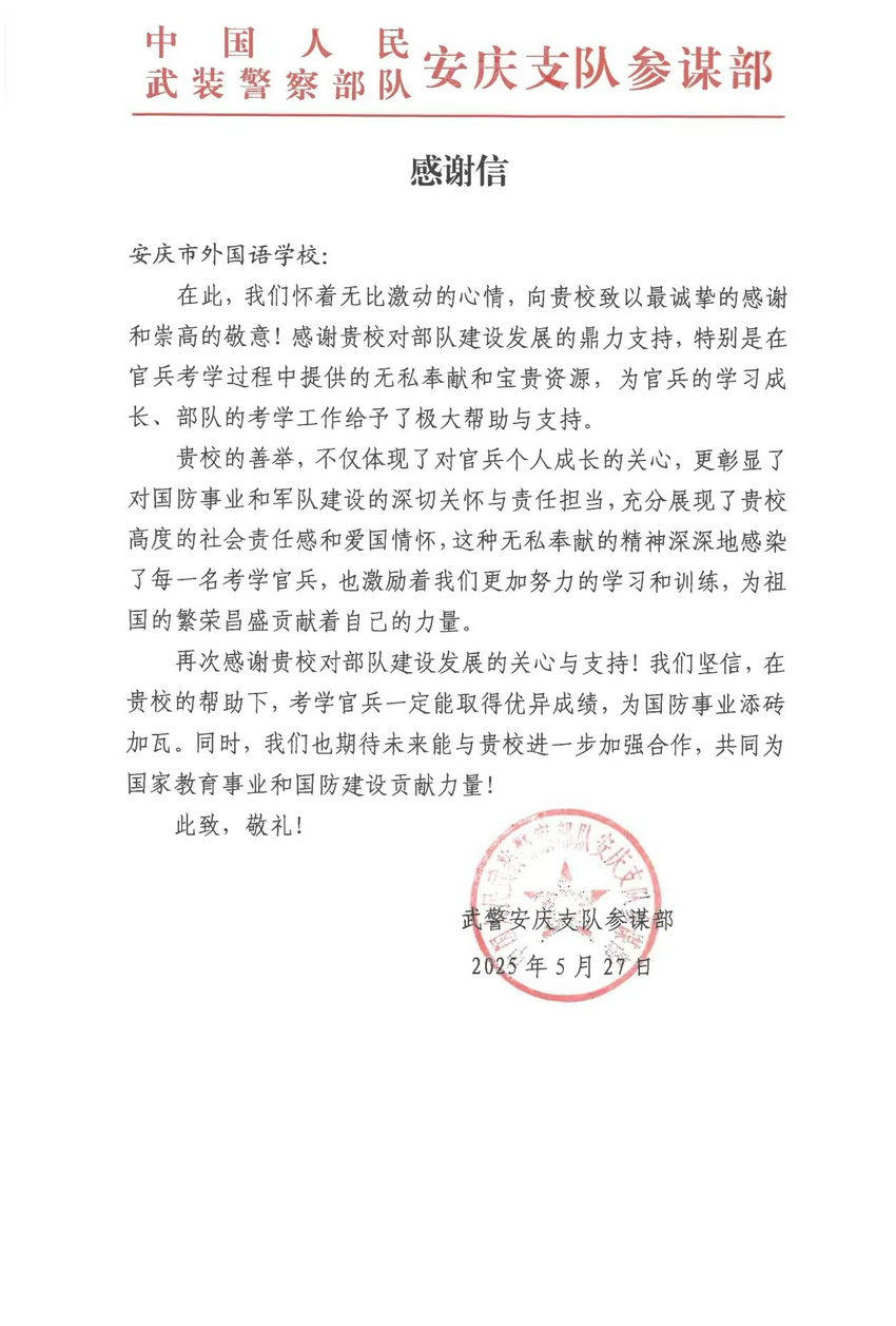 安庆市外国语学校与武警安庆支队是军民共建友好单位。又是一年军考“冲刺期”,应部队邀请,我校于2025年5月份从高中部选派优秀教师,针对部队官兵文化课实际情况,制定辅导计划,助力部队军考,帮助部队“追梦人”圆梦考场。
