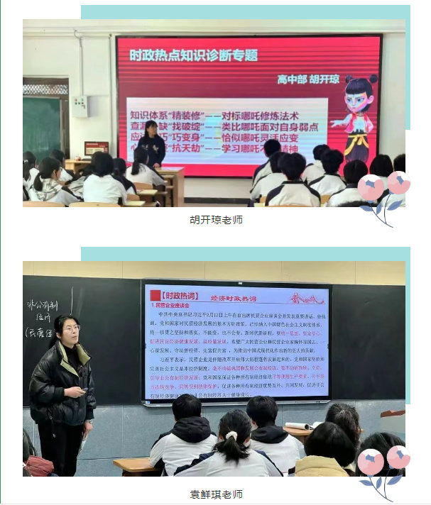 4月8日上午,政治组胡开琼老师在《时政热点知识诊断专题》示范课中,以《哪吒2》切入,串联哲学知识,引导学生用政治知识分析热点,课堂过渡自然、结构合理,多媒体运用得当。3月4日上午,袁鲜琪老师于图书馆开《生产资料所有制与经济体制》公开课,徐最太校助、徐海宏主任等观摩。袁老师以抖音视频导入,融合热点,知识梳理清晰,借真题演练精准指导,助学生掌握技巧。老师们勇于探索,共筑优质课堂。