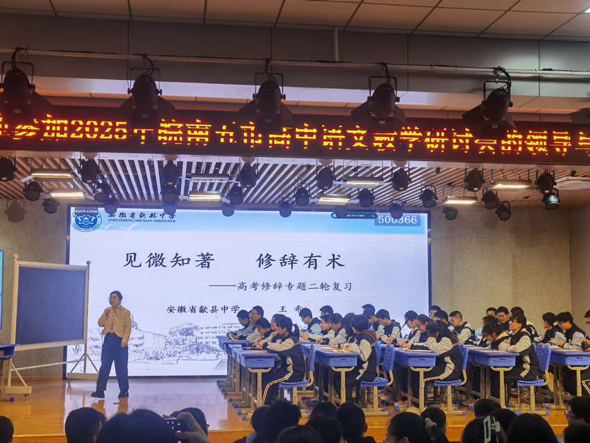 上午的研讨活动在两节精彩绝伦的二轮复习示范课中拉开帷幕。黄山市歙县中学的王希老师带来“见微知著,修辞有术”,聚焦修辞手法专题。课堂上,王老师巧妙布局,围绕三大任务层层递进:从“重温旧学,启悟心思”,唤醒学生脑海中沉睡的修辞知识;到“精准答案,思维突破”,引导学生剖析答题要点,实现思维进阶;再到“跟踪训练,提升思辨能力”,通过实战演练,让学生将知识转化为能力 。整堂课层次分明、深入浅出,为后续复习备考点亮了一盏明灯,让我们深刻认识到在复习中引导学生构建知识体系、提升思维能力的重要性。