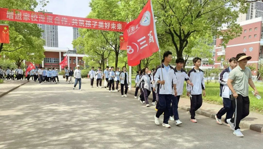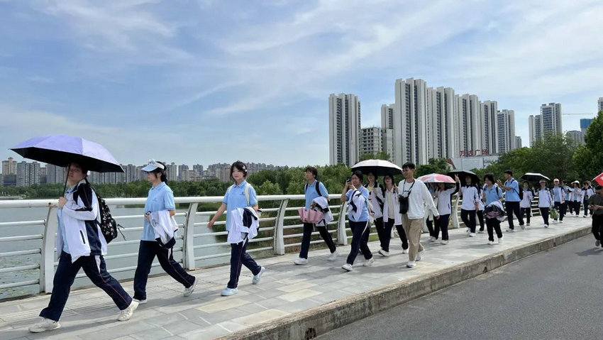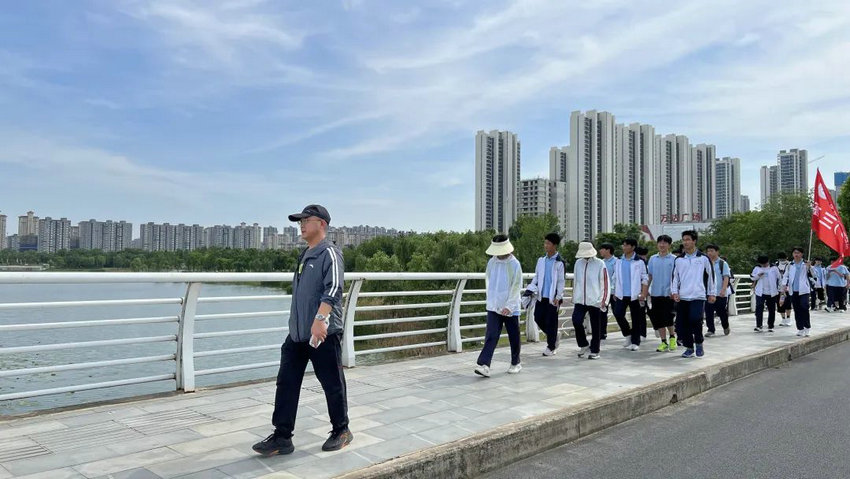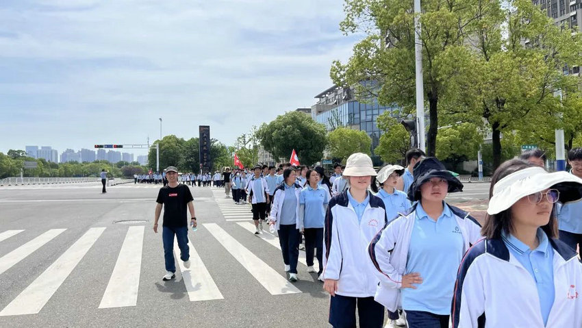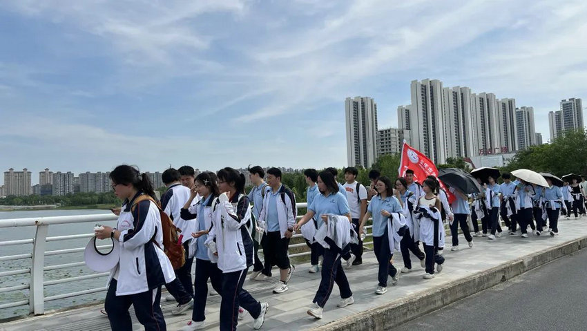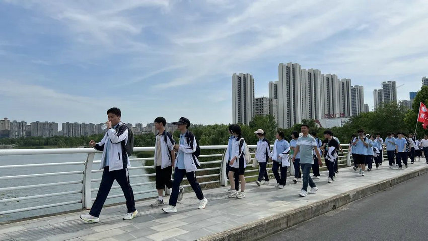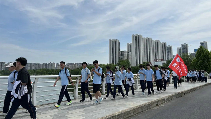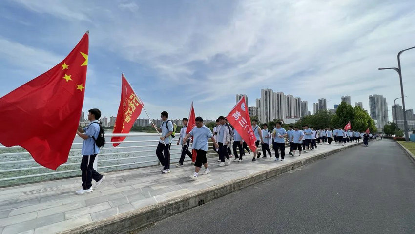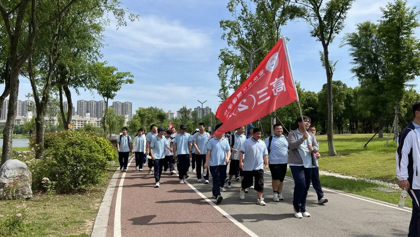 尽管烈日炙烤、双腿酸胀,但同学们始终保持整齐队列,师生们将不服输的倔强与拼搏的热望,深深镌刻进属于高三的鎏金岁月。老师们全程陪护,或为学生递上矿泉水,或用鼓励的话语驱散疲惫,师生同行的画面成为五月里最动人的风景。在这场长达3个多小时的毅行中,没有人掉队,没有人放弃,大家用脚步丈量了坚持的力量,用汗水浇灌了团队的友谊。