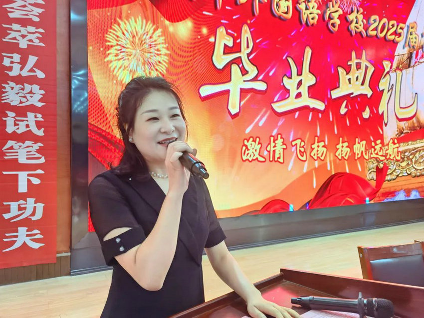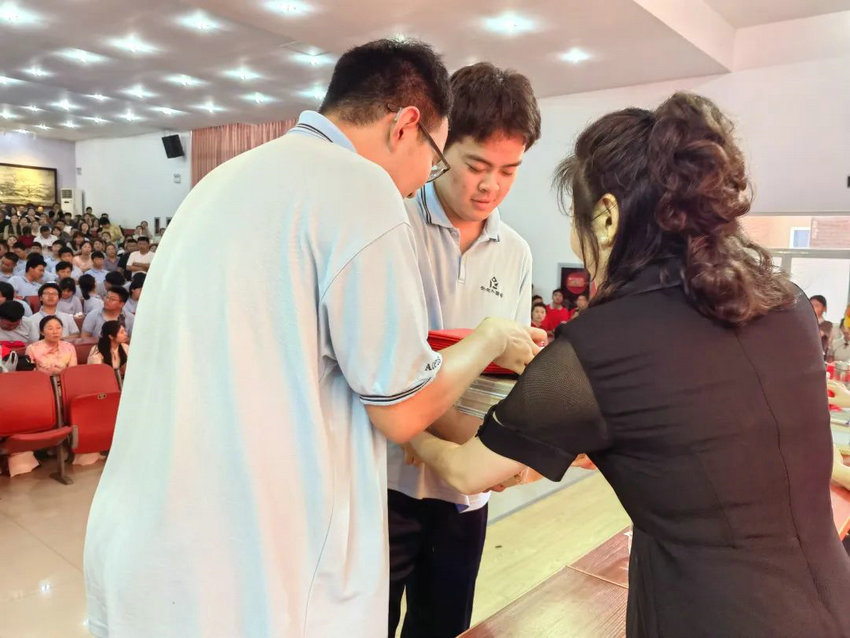 副主任朱炎炎宣读2025届毕业文件。接着学校领导和嘉宾为学生发毕业纪念册和毕业合影。