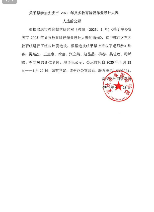 关于拟参加安庆市 2025 年义务教育阶段作业设计大赛 人选的公示
