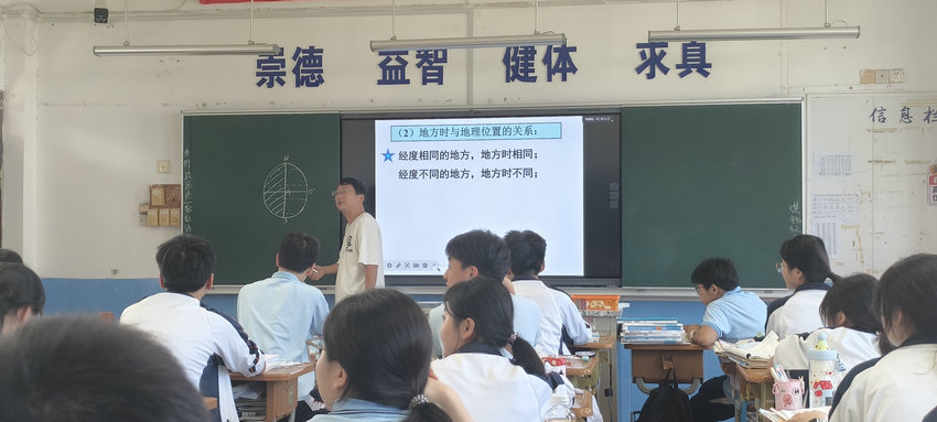 课堂初始,许冬冬老师借助多媒体,清晰呈现“地方时与地理位置的关系”:“经度相同的地方,地方时相同;经度不同的地方,地方时不同”。话音刚落,他转身在黑板上快速勾勒出地球经纬示意图,以地球自转规律为切入点,用粉笔沿着经线和晨昏线缓缓标注,一步步推导地方时的计算原理。粉笔与黑板摩擦发出的沙沙声里,经纬线、晨昏线逐渐构成清晰的几何图形,帮助学生建立空间想象。