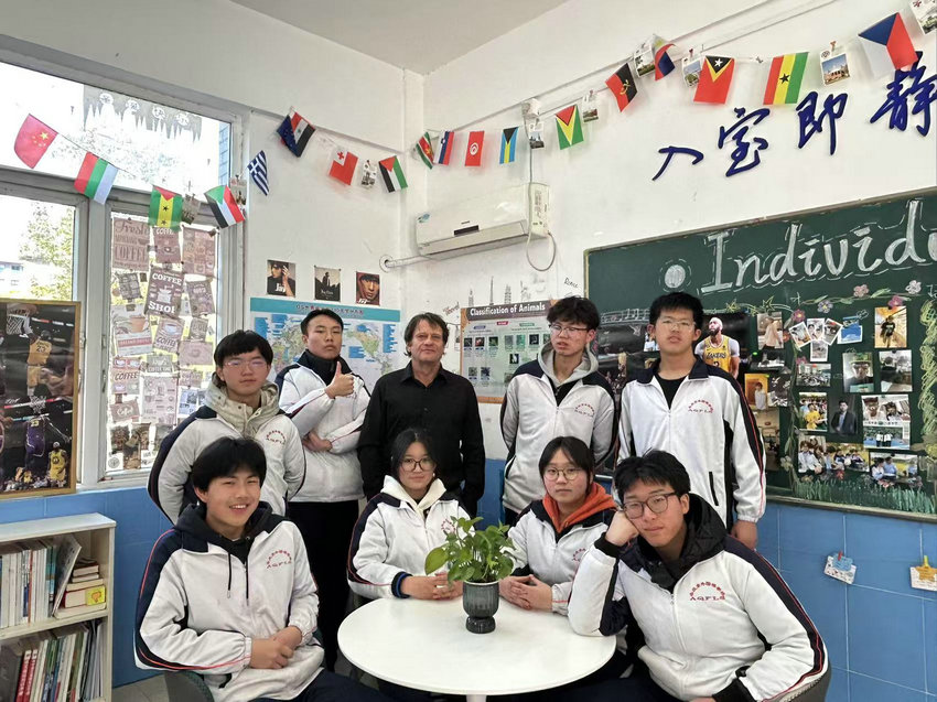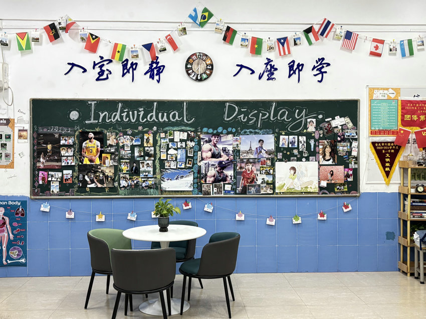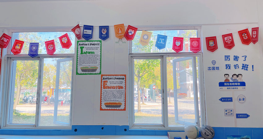 与210班的浪漫氛围形成鲜明对比,110班以极简风诠释学术精神。教室墙面采用模块化设计,动态展示ib课程核心教学方法论、ap课程知识图谱等国际教育特色内容。最引人注目的是天花板悬挂的qs世界大学排名前50名校校徽旗帜,哈佛、牛津等学府标识随风轻扬,形成独特的"知识穹顶"。班主任aster peng表示:"这些视觉化呈现既是学科知识的延伸,也是对学生的目标激励,让国际化教育理念真正'看得见'。"