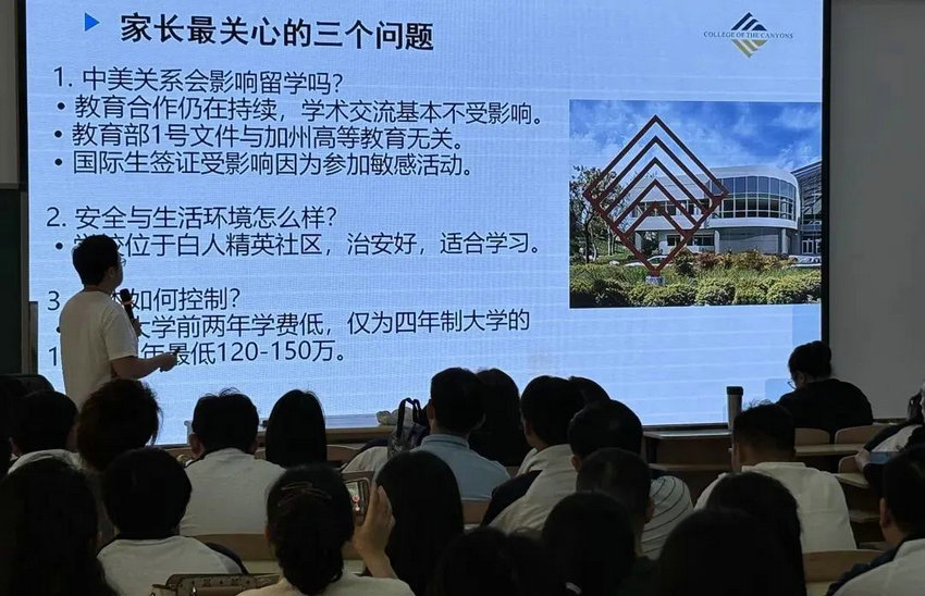 安全与生活环境:通过视频展示,家长们直观了解到峡谷大学所在的圣塔克拉利塔市连续多年入选fbi"全美最安全城市"前十名,校园安保系统完善,为留学生提供全方位保护。