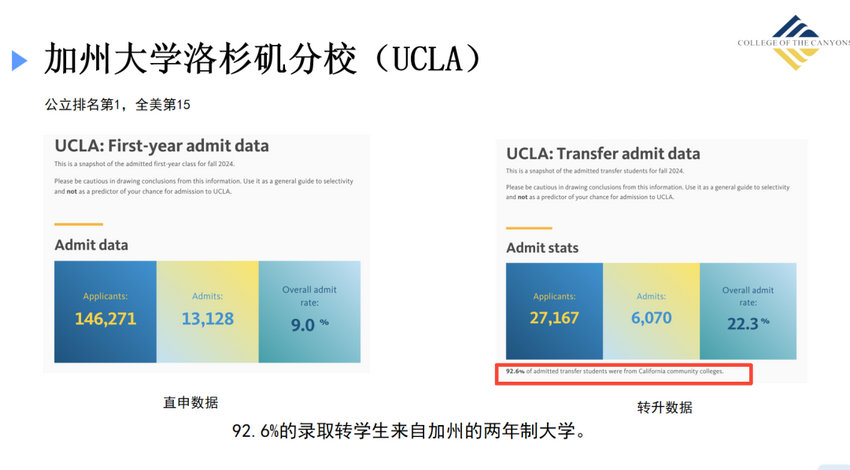 国内高考竞争激烈:2024年安徽省985录取率仅为1.2%,而通过峡谷大学转入ucla的比例高达22.3%。加州大学转学优势: