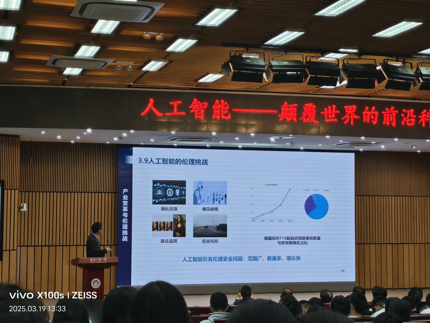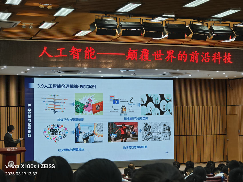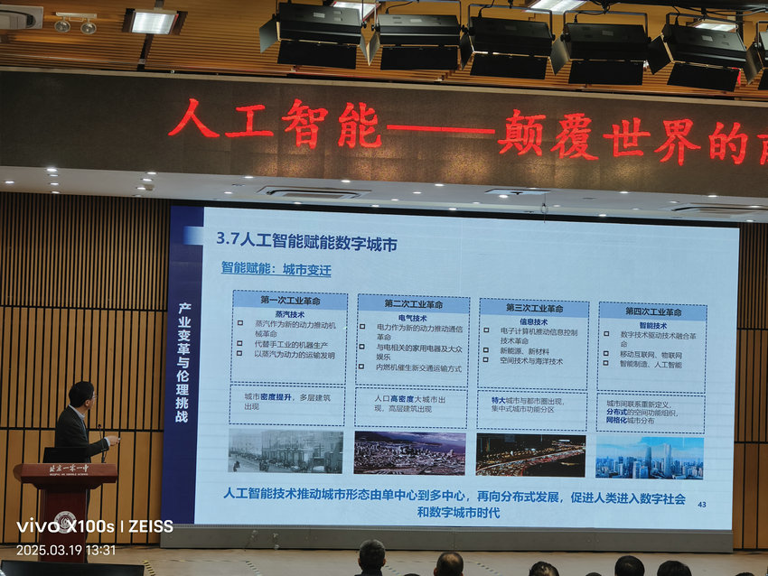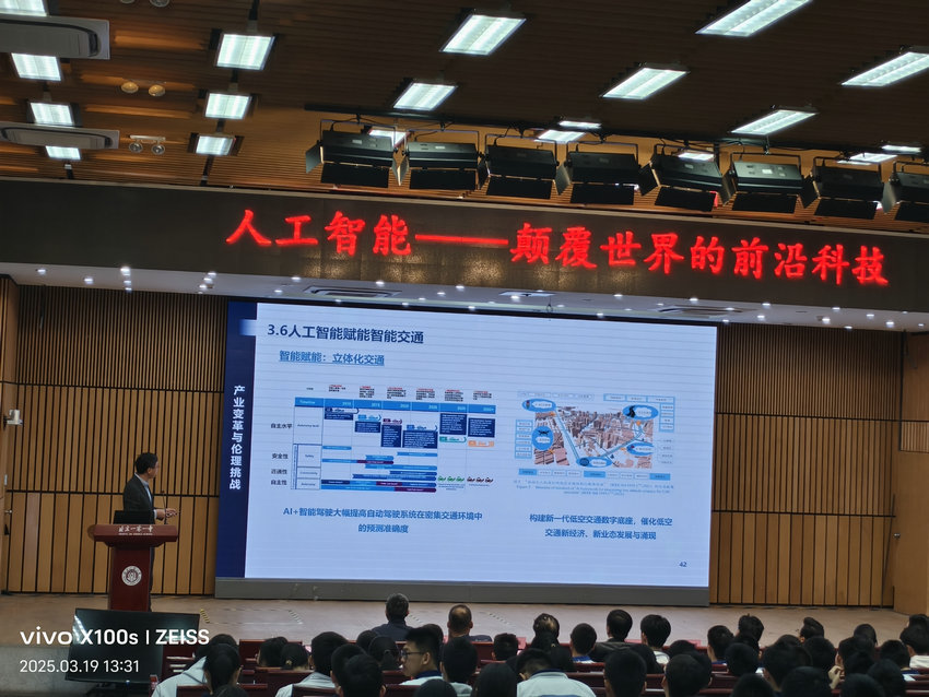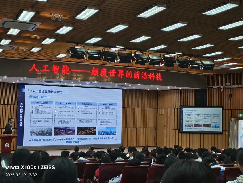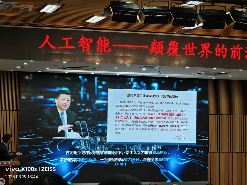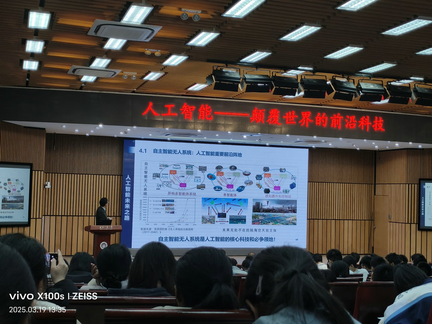 揭幕仪式结束后,全场目光聚焦在陈杰院士身上。院士以其渊博的知识和独到的见解,围绕“人工智能-颠覆世界的前沿科技”展开了一场精彩绝伦的演讲。从人工智能的起源演进与研究范畴,到科学前沿与发展态势,再到产业变革与伦理挑战,最后对人工智能未来之路进行深入探讨,每一个方面都引发了老师们深深的思考。在讲述过程中,陈杰院士还不忘介绍哈尔滨工业大学在相关领域的研究成果与探索,让大家对高校科研有了更直观的认识。