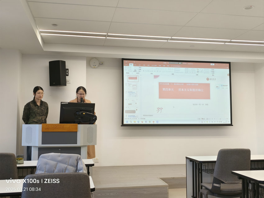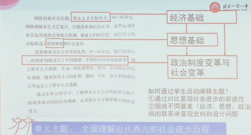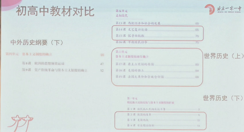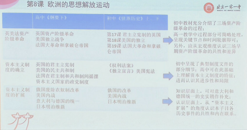 活动中,北京101中学的李霞老师作为主讲人,以深厚的专业素养和丰富的教学经验,为在场教师带来了一场知识与智慧交融的盛宴。李老师首先着眼于教学内容的衔接,对第四单元资本主义制度中第八课欧洲思想解放运动、第九课资产阶级革命与资本主义制度的确立的高中教材内容,与初中阶段相关内容进行条分缕析的对比。这一对比,精准地找到了初高中历史教学的差异点与衔接点,让参会教师明晰在高中教学中应如何深化学生对历史知识的理解与运用。