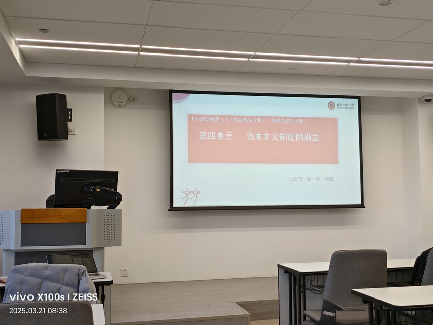 3月21日上午八点,我校高中部历史组朱炎炎老师满怀热忱参加由北京101中学组织的海淀区历史教研活动,深入学习中外历史人物纲要下册第四单元的大单元教学理念与方法。