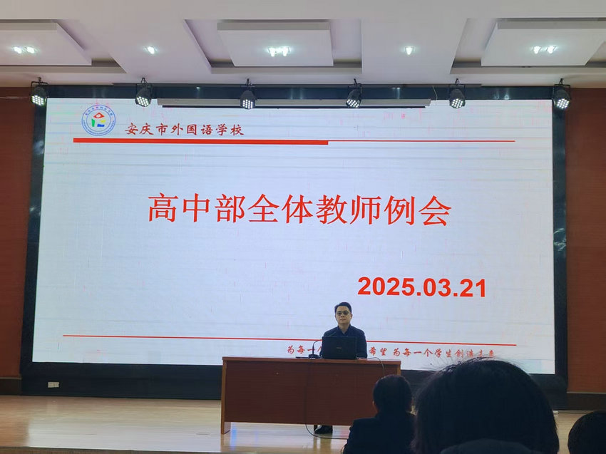 2025年3月21日中午,我校高中部在校东区大报告厅举行了全体教师例会,会议全面总结了近期教学成果,并对下一阶段工作进行了部署。校长助理徐最太,高中部副主任徐海宏、江生友,国际部主任王银钗及高中部全体教师出席会议,本次会议由徐最太校长助理主持召开。