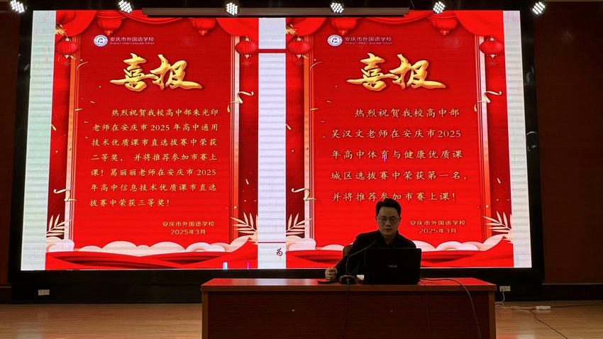 会上,徐最太校长助理首先展示喜报,朱光印老师在安庆市 2025 年高中通用技术优质课市直选拔赛获二等奖并将参加市赛上课,葛丽丽老师获高中信息技术优质课市直选拔赛三等奖,吴汉文老师在高中体育与健康优质课城区选拔赛获第一名并将参加市赛上课,彰显教师风采。