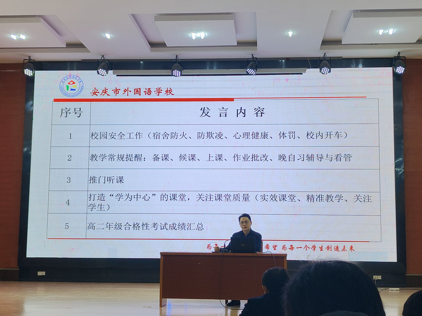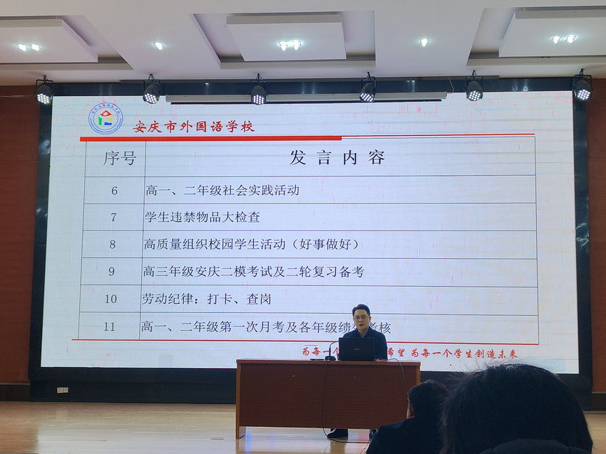 随后围绕教学与管理展开多项议程。教学方面,提醒教师做好备课、候课等教学常规,推行推门听课,打造“学为中心”课堂;同时对高二年级合格性考试成绩进行汇总,对高三年级安庆二模考试及二轮复习备考、高一高二年级第一次月考及各年级绩效考核做出安排。管理层面,强调校园安全工作,包括宿舍防火、防欺凌等;还提及学生违禁物品大检查、高质量组织校园学生活动,以及劳动纪律中的打卡、查岗等事项。