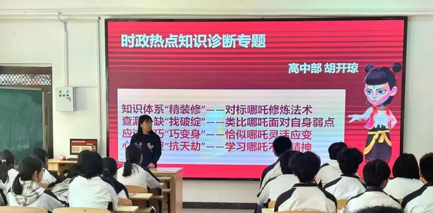 胡开琼老师是高中部政治组骨干教师,安外名师,此次在示范课《时政热点知识诊断专题》中,胡老师以《哪吒2》为切入点,有效串联哲学各个章节的核心知识,提升学生理论联系实际的能力。引导学生学会用政治知识分析热点现象,注重创设问题情境,充分发挥学生主体作用,不断引导学生运用科学分析方法深入认识事物,让学生在参与中体验、感受、领悟。整堂课过渡自然流畅,课堂结构合理连贯。教师语言生动,富有启发性,具有很强亲和力。多媒体手段应用得当,对课堂内容的拓展延伸起到重要辅助作用。