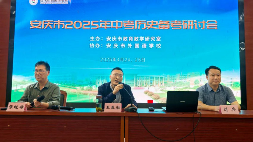 蔷薇花开,风和日丽。4月24日下午,2025年安庆市中考历史备考研讨会课堂教学展示和中考一模总结环节在我校报告厅开展。安庆市教育教学研究室王艮胜副主任,历史教研员张皖宿主任,我校刘兵副校长等参加此次研讨会。本次活动还汇聚了安庆各市、县、区历史学科教研员和一线教师,共同聚焦历史教学,把握中考脉搏,探索历史教育发展新方向。