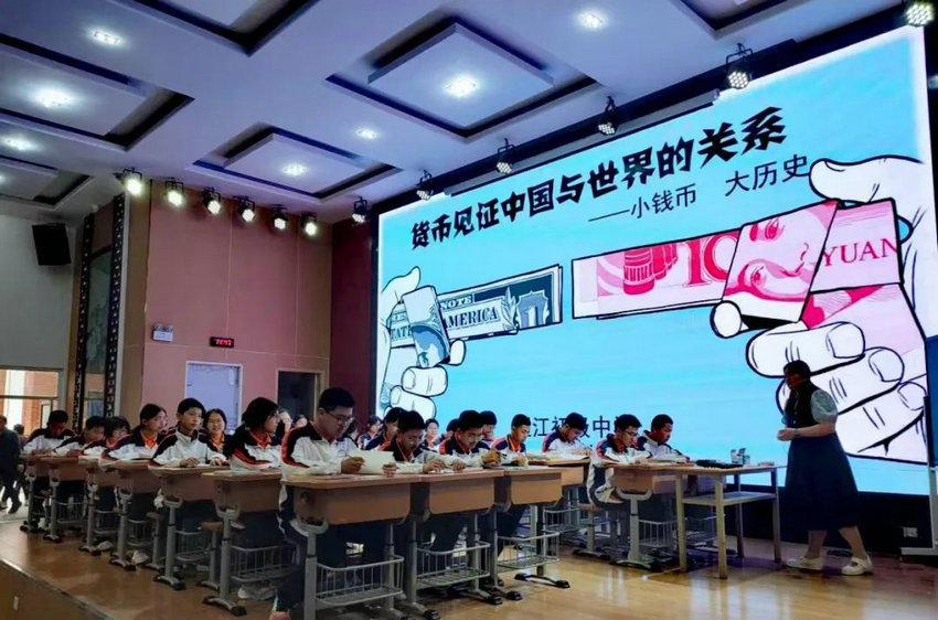 望江初级中学的刘护生老师则带来《货币见证中国与世界的关系——小钱币,大历史》展示课。刘老师从当今时政导入,运用视频将学生拉进各式各样的货币情景中。通过展示不同时期、不同样式的货币实物图片、历史文献记载等,引导学生探究货币背后的历史事件,追寻中国古代货币的演变过程以及货币上所见证的中外关系,包括“一带一路”的影响。用小小的货币为学生串联出一个个鲜活的历史情境。感知货币作为经济文化交流载体的重要作用,感受中国与世界在经济、文化等方面的交流与融合。 新颖的视角、丰富的史料,让学生们沉浸其中,也充分激活学生积累的历史知识,引发学生深度思考和探究。