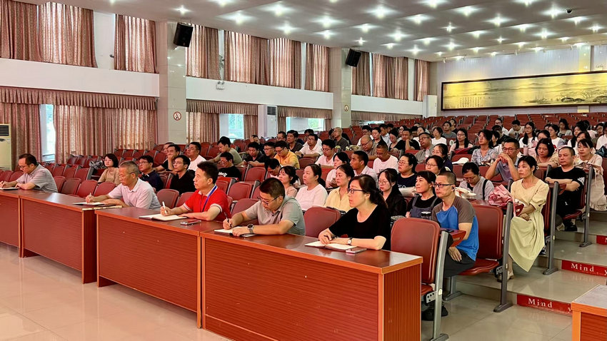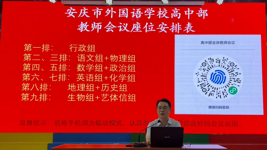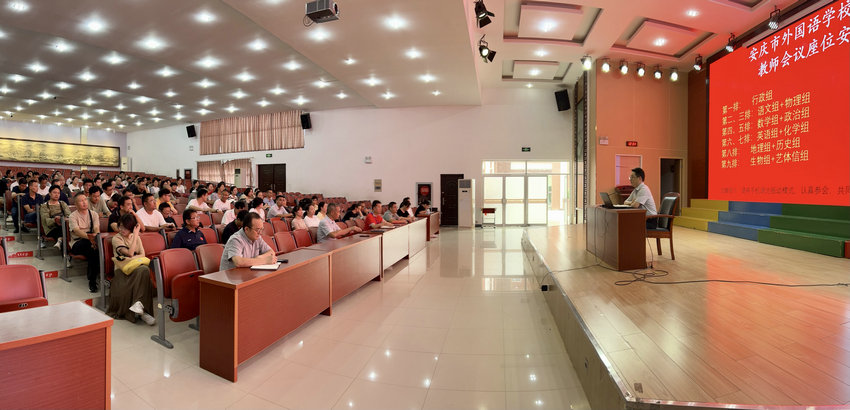9月12日中午,安庆市外国语学校高中部全体教师例会于学校东区大报告厅召开。会议由校长助理徐最太主持,副校长肖清克,国际部王银钗主任,高中部徐海宏主任、江生友主任、朱炎炎主任及高中部全体教师参会,共同明确近期工作方向和要求。