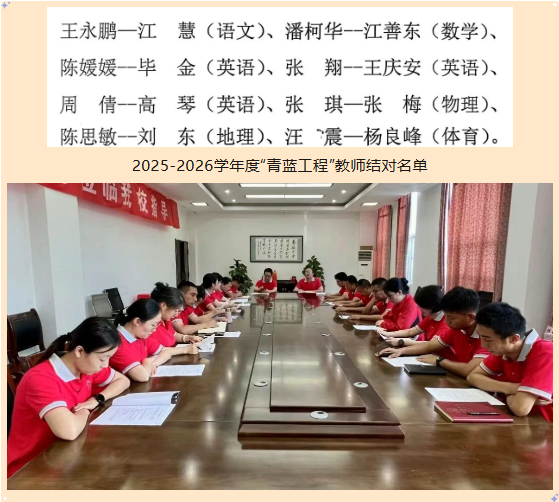“青蓝结对,薪火相传;师徒携手,共促成长。”9月22日下午,我校高中部在行政楼一楼会议室举行2025-2026学年度“青蓝工程”师徒结对仪式,高中部负责人徐最太校长助理,副主任江生友、朱炎炎及参与师徒结对的各学科教师共同参加了本次仪式。“青蓝工程”活动旨在搭建教学相长的成长平台,充分发挥骨干教师“传、帮、带”的引领辐射作用,助力青年教师夯实教育教学根基、加速专业成长步伐,同时推动师资队伍整体素质提升,为学校教育高质量发展注入鲜活力量。