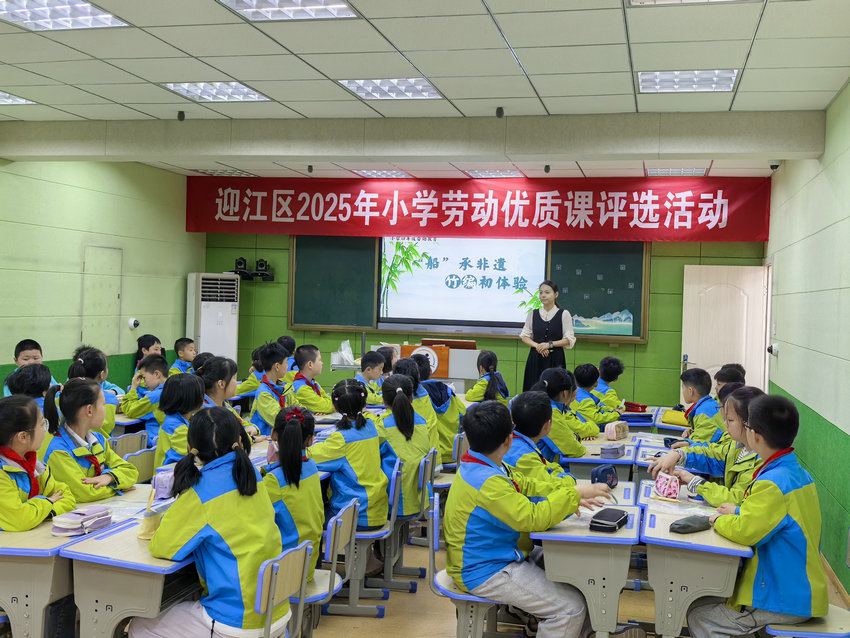 易颖老师的这节劳动课《“船”承非遗,竹编初体验》,立足于我国的非遗技术:“竹编”,带着四年级的学生感受竹编文化的悠久历史,体会传统竹编匠人坚持和执着的精神,并且在课堂上亲手编制竹编船。学生们虽然初次体验竹编,但易老师深入浅出的讲解,让学生们很快就掌握了竹编的基本编法,一条条小小的竹编船在孩子们灵巧的双手下诞生了。