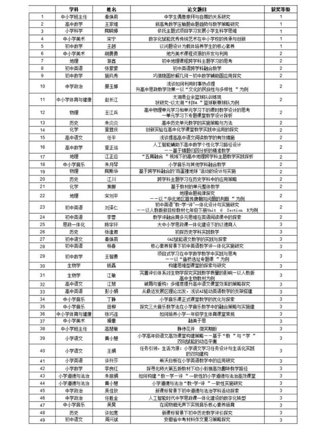 在全市报送的3300多篇教育教学论文中,我校教师凭借扎实的研究基础和优秀的论文质量脱颖而出,共有49篇论文获奖,其中一等奖5篇,二等奖19篇,三等奖25篇,获奖数量与质量双双实现新突破,在全市中小学中名列前茅!让我们向获奖的老师们表示祝贺!