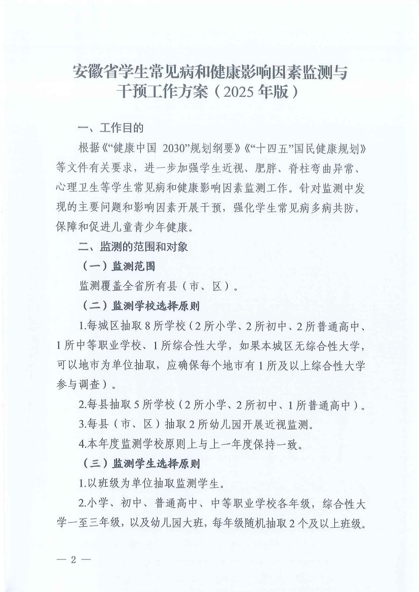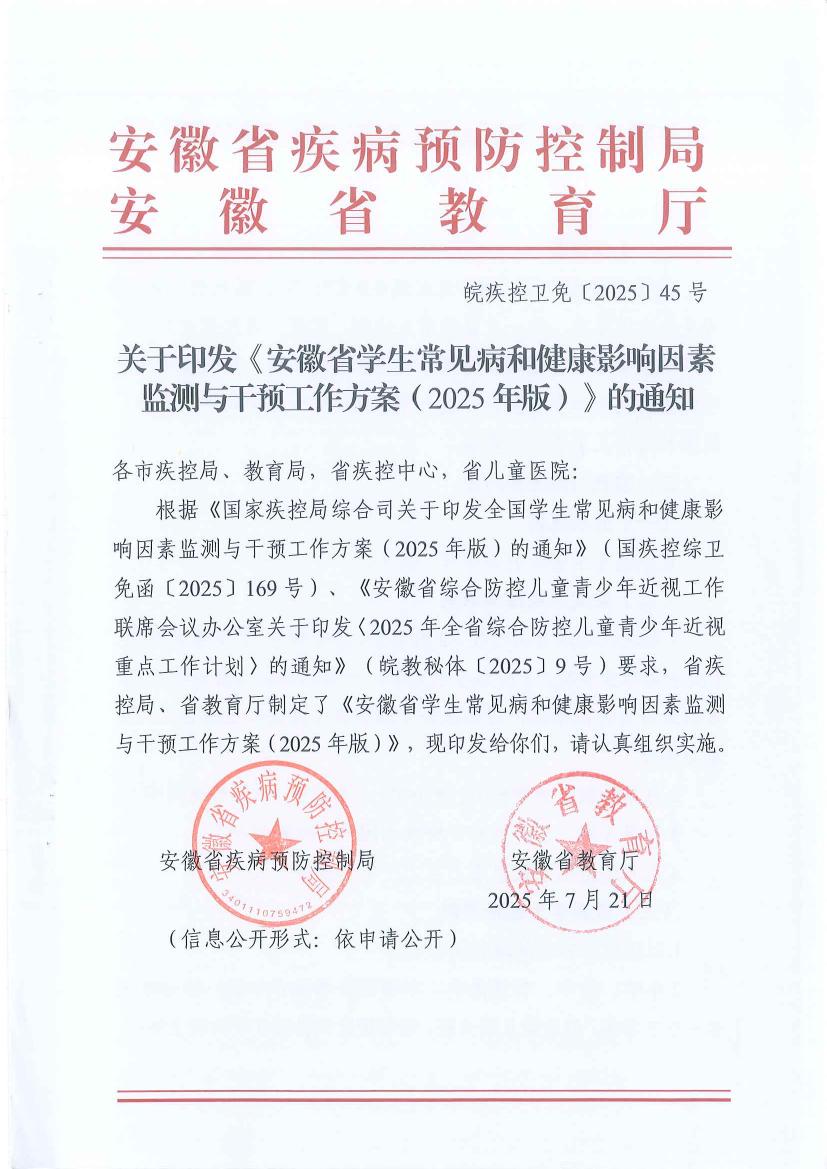 关于印发《安徽省学生常见病和健康影响因素与干预工作方案(2025年版)》的通知