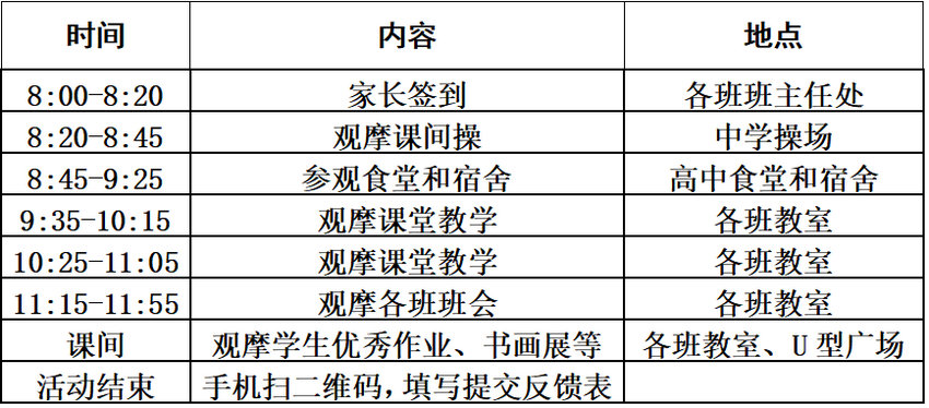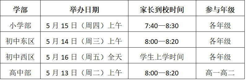 2、东区校园内停车场对家长开放<停满为止,建议家长选择公共交通方式>,但请家长按照表中时间进入校园,以免影响学生接送车进出校园;