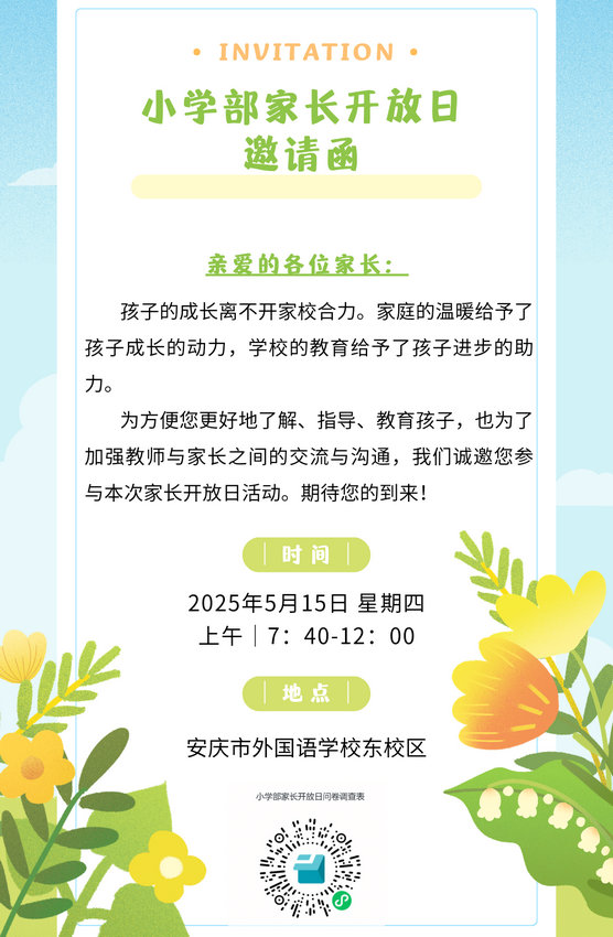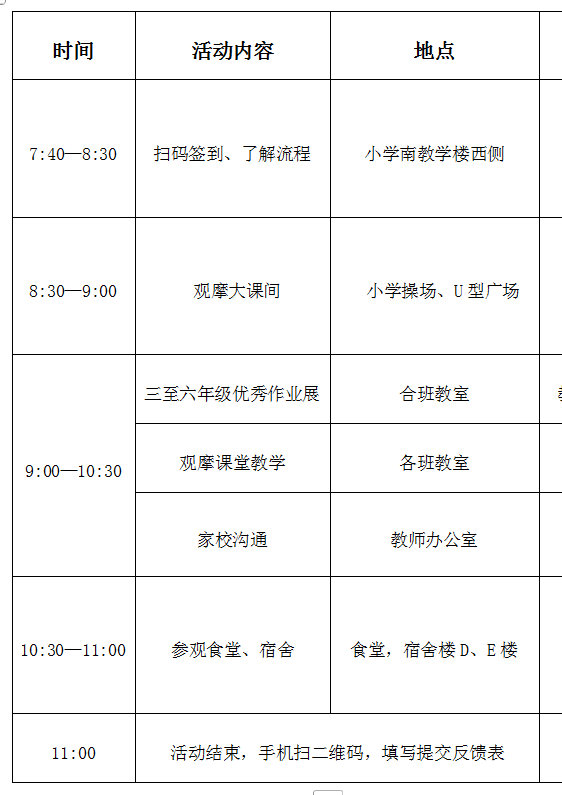 参观宿舍和学生就餐,让家长们对孩子们的日常生活有了更全面的了解。活动在11:30圆满结束,家长们通过扫描二维码填写了反馈表,为我们提供了宝贵的意见和建议。