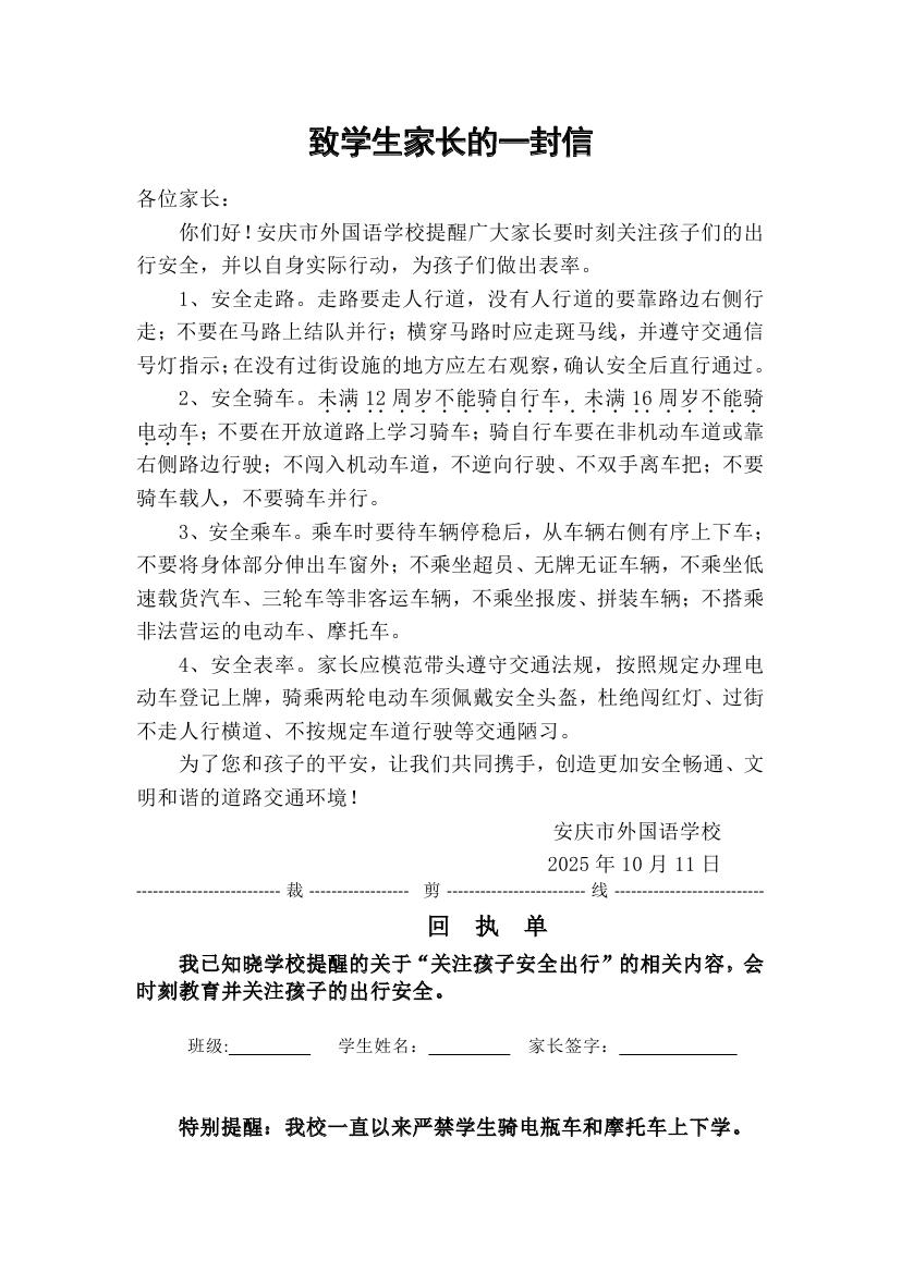 致学生家长一封信(交通安全) -九游会官网登录入口网页