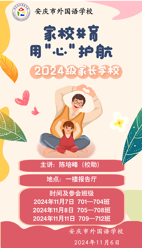此次讲座不仅为家长们提供了一个宝贵的学习和交流平台,也为家庭教育注入了新的活力和思路。相信在家长们的共同努力下,孩子们一定能够在更加健康、和谐的家庭环境中茁壮成长,成为社会的有用之才。安庆市外国语学校也将继续举办类似的家长教育活动,为家长们提供更多的学习机会和交流平台,共同推动家庭教育的不断进步。
