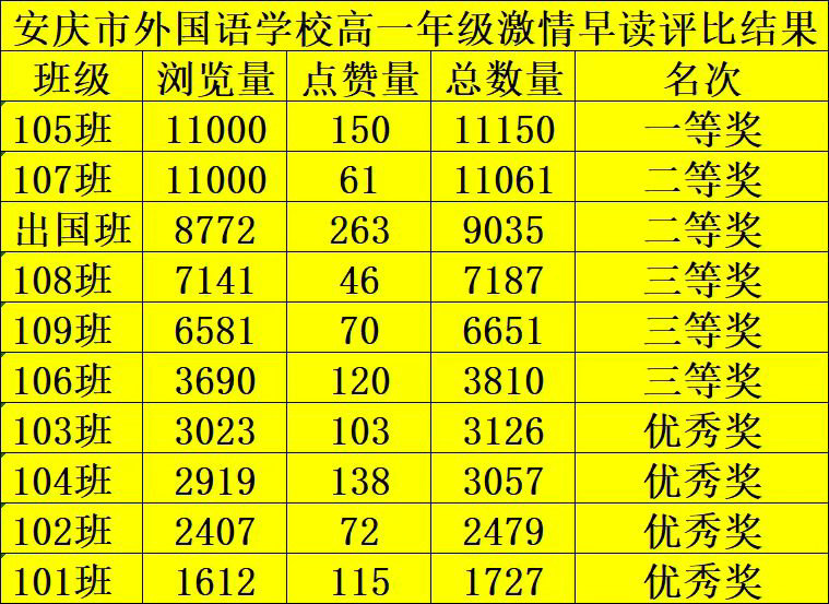 经过激烈的线上角逐,评选结果终于出炉。105班凭借同学们整齐有力的诵读和昂扬的精神面貌,荣获一等奖“最佳人气班级”称号。他们的视频展现出了强大的班级凝聚力和积极向上的学习氛围,赢得了众多好评。107班和出国班紧随其后,获得二等奖“优秀人气班级”荣誉,其特色早读形式同样得到了大家的认可。