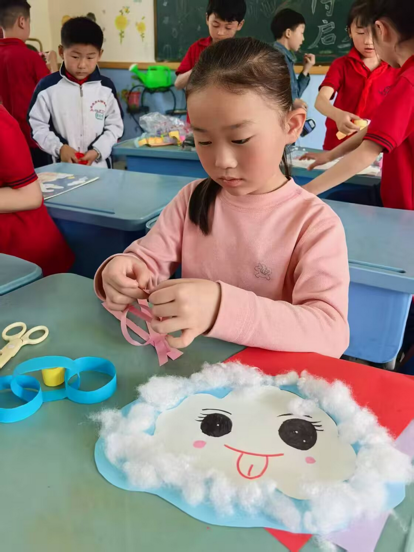 手工制作环节更是热闹非凡,孩子们运用棉花、彩纸、黏土等材料,制作出立体的云朵作品。有的同学制作了可以挂在教室的云朵风铃,微风吹过,风铃轻轻晃动,仿佛将天空中的云朵带到了身边;还有同学用棉花做出软绵绵的云朵玩偶,十分逼真。