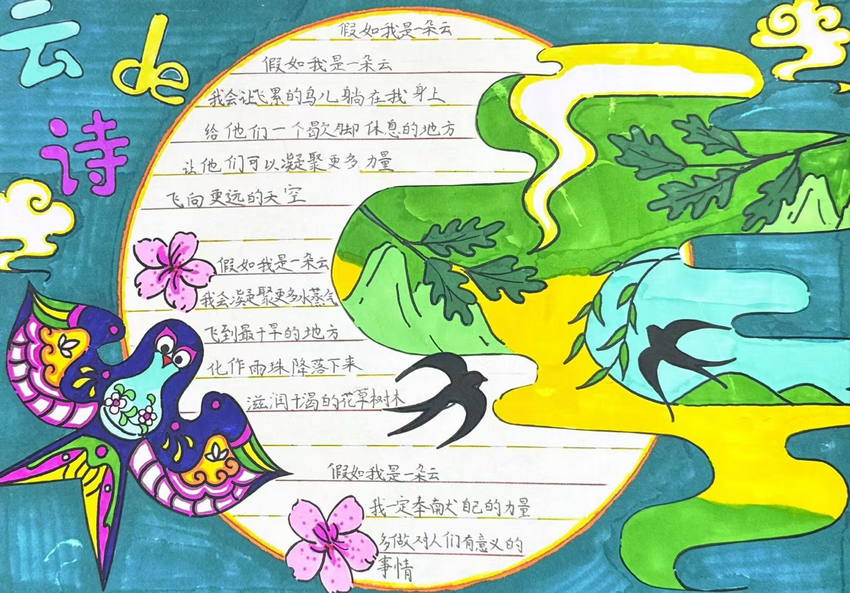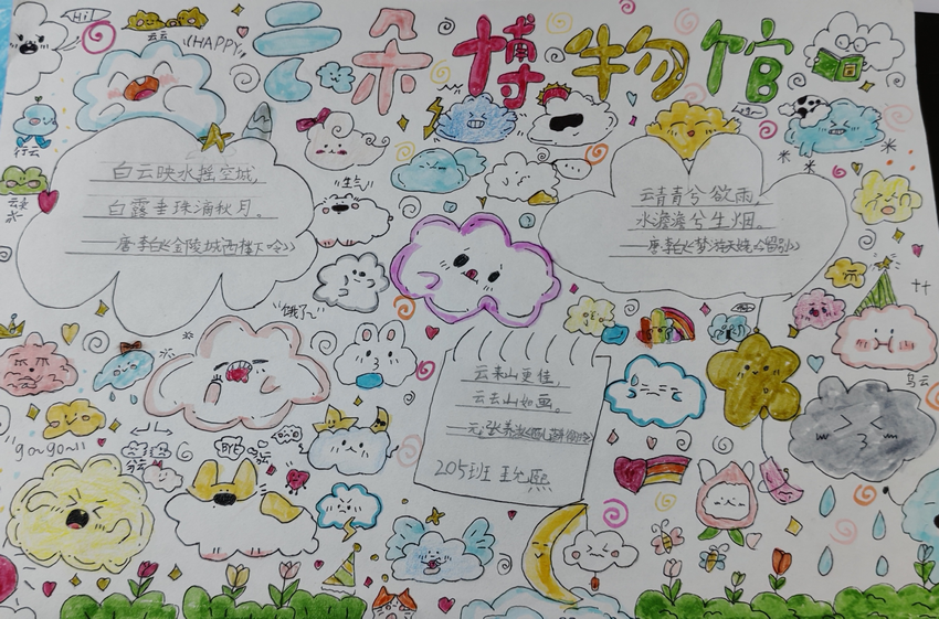 活动现场,孩子们热情高涨。制作手抄报时,大家用五彩画笔在画纸上描绘心中的云朵,有的将云朵画成可爱的小动物形状,有的则把云朵和梦幻城堡组合在一起,每一幅手抄报都充满童趣。