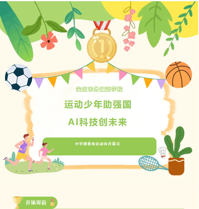 春意盎然,活力飞扬!在这充满希望的季节里,外国语学校小学部迎来了第十七届春季运动会。4月28日上午,全体师生齐聚操场,以“运动少年助强国,ai科技创未来”为主题,开启了一场激情与创意并存的开幕式盛宴。孩子们用矫健的身姿、创新的表演,展现了新时代少年的风采,更用科技与运动的融合,点亮了强国梦想!