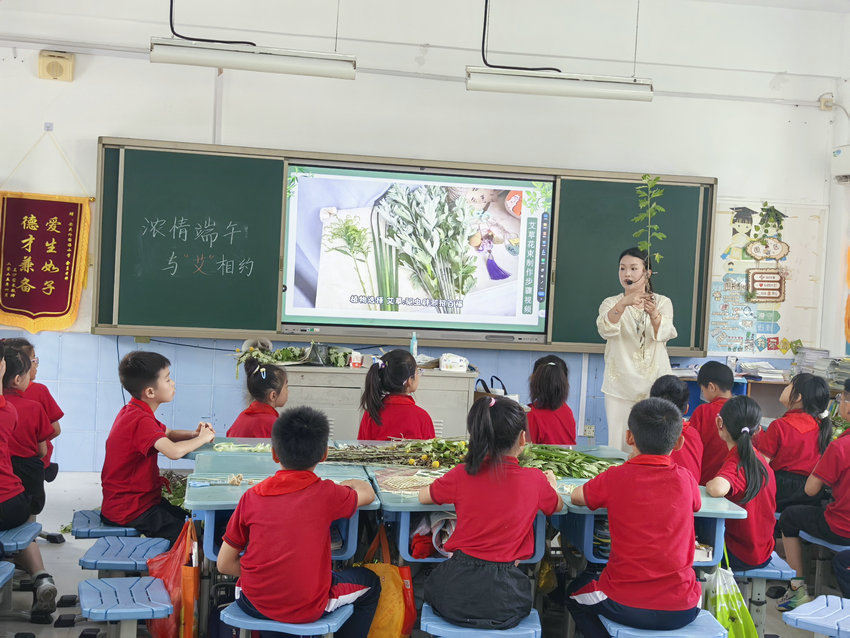 上课伊始,余老师用生动有趣的语言为孩子们讲述端午挂艾草的渊源。从“手执艾旗招百福,门悬蒲剑斩千邪”的古老传说,到艾草驱虫避瘟、祈福安康的实际功效,孩子们听得津津有味,眼中闪烁着对传统文化的好奇与向往,仿佛穿越千年,与古人共话端午习俗。