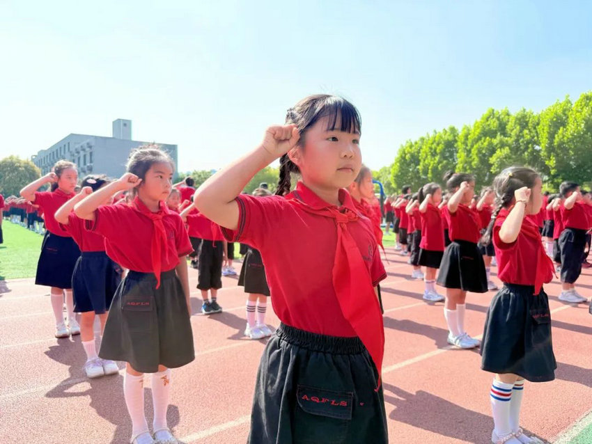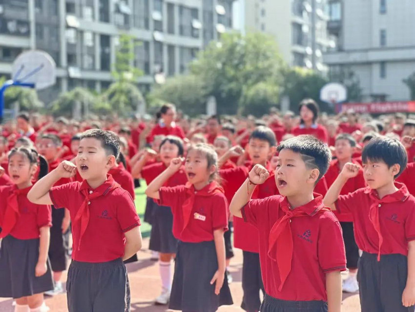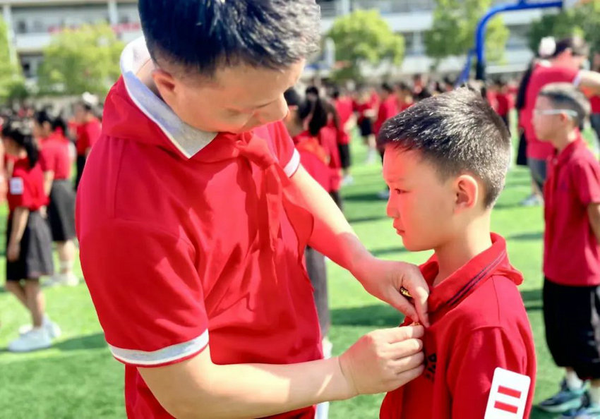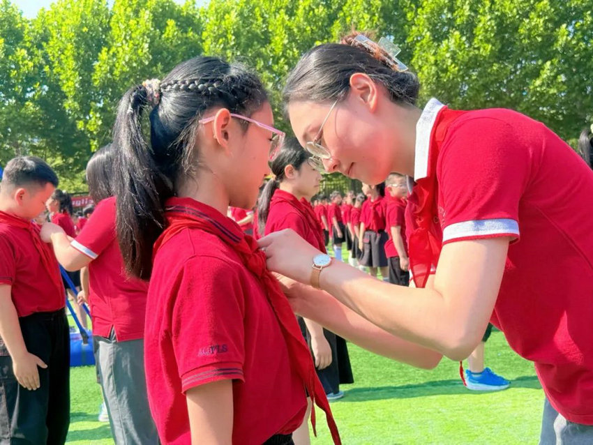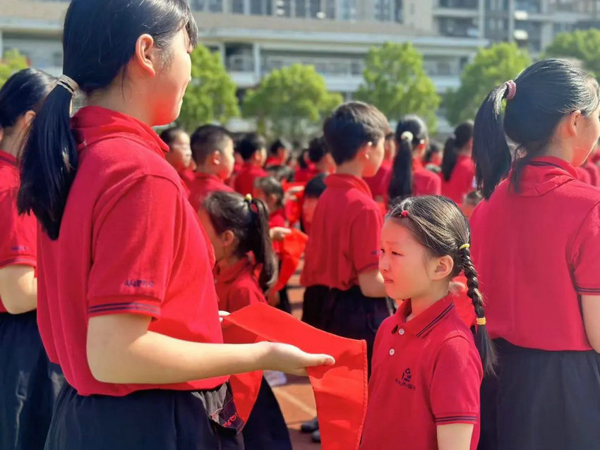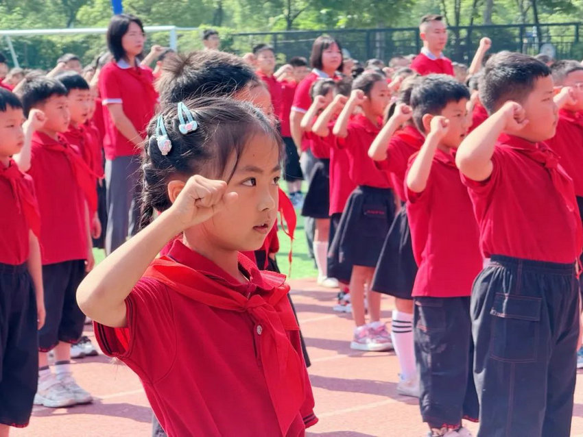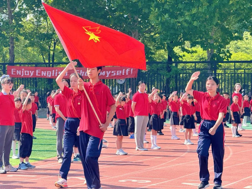 在初夏灿烂的阳光下,鲜红的队旗迎风招展。5月30日上午,小学部全体师生齐聚操场,共同见证91名一年级同学加入中国少年先锋队的光荣时刻。