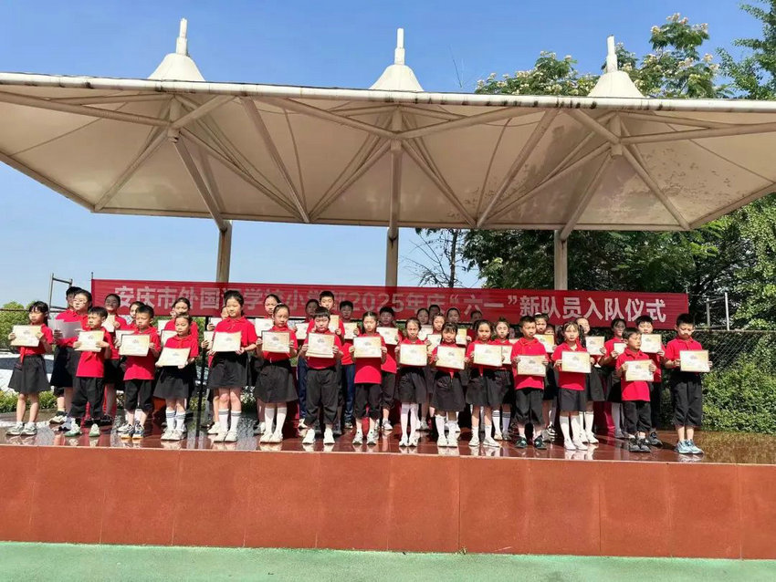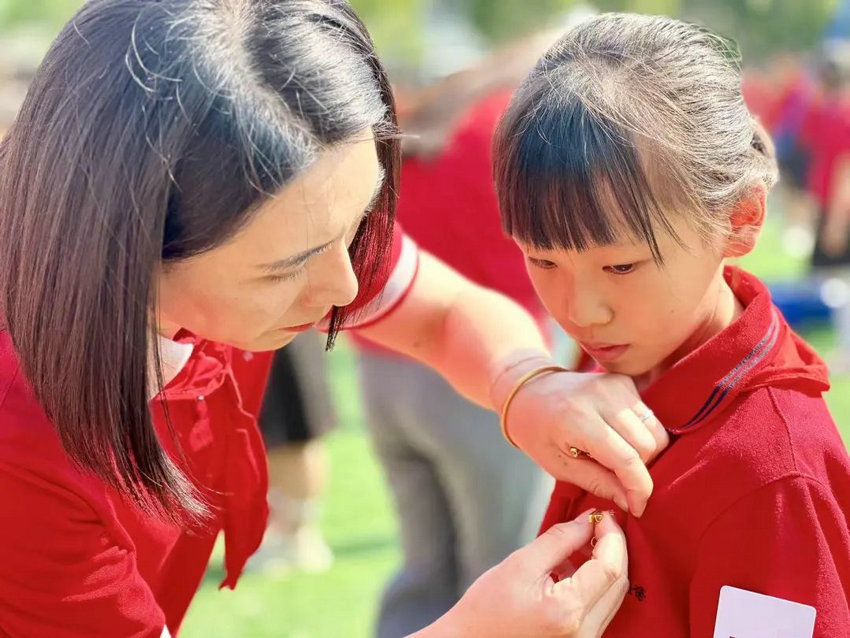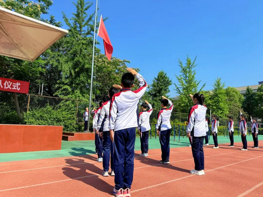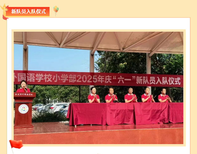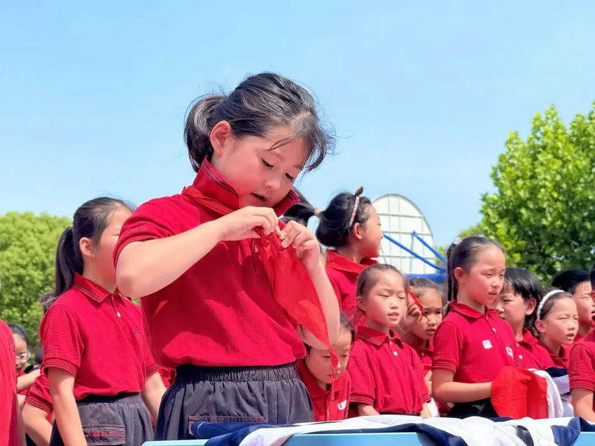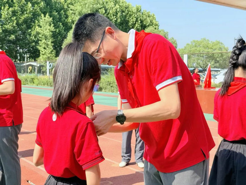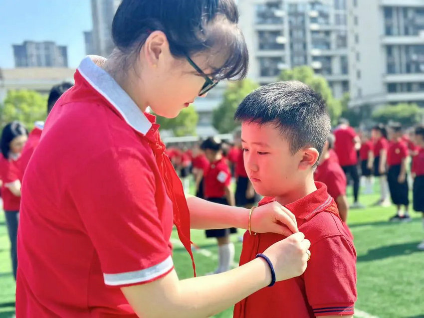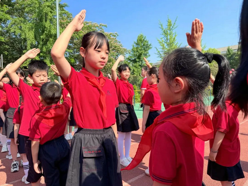 在初夏灿烂的阳光下,鲜红的队旗迎风招展。5月30日上午,小学部全体师生齐聚操场,共同见证91名一年级同学加入中国少年先锋队的光荣时刻。