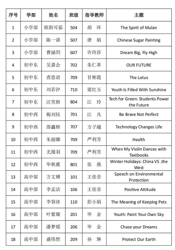 初赛阶段,小学部4-6年级、初中部东西两区及高中部共提交192份参赛视频。经外教和英语教师团队公平评审,18名选手凭借出色的表现斩获初赛一等奖,并晋级决赛。他们中,有的以环保为主题呼吁行动,有的用成长故事打动人心,有的借科技发展展望未来……语言是桥梁,而他们的演讲,正让世界听见中国青年的声音。