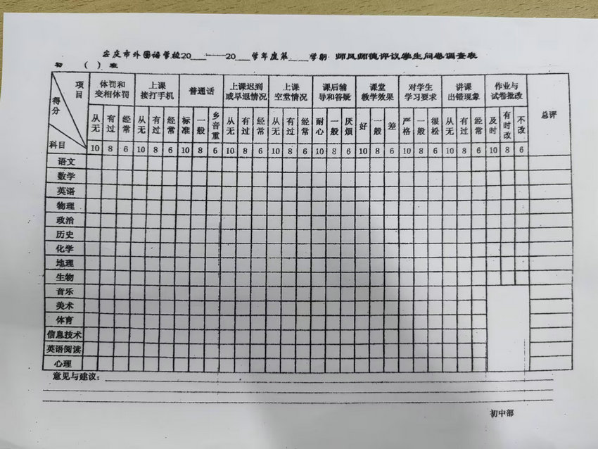 为构建和谐师生关系,全面提升教师队伍师德素养,2025年6月19日,初中部东区面向学生开展师风师德专项调查活动。本次调查以学生为核心视角,全面了解教师在教育教学、师生互动等方面的表现,为优化教师队伍建设提供科学依据。