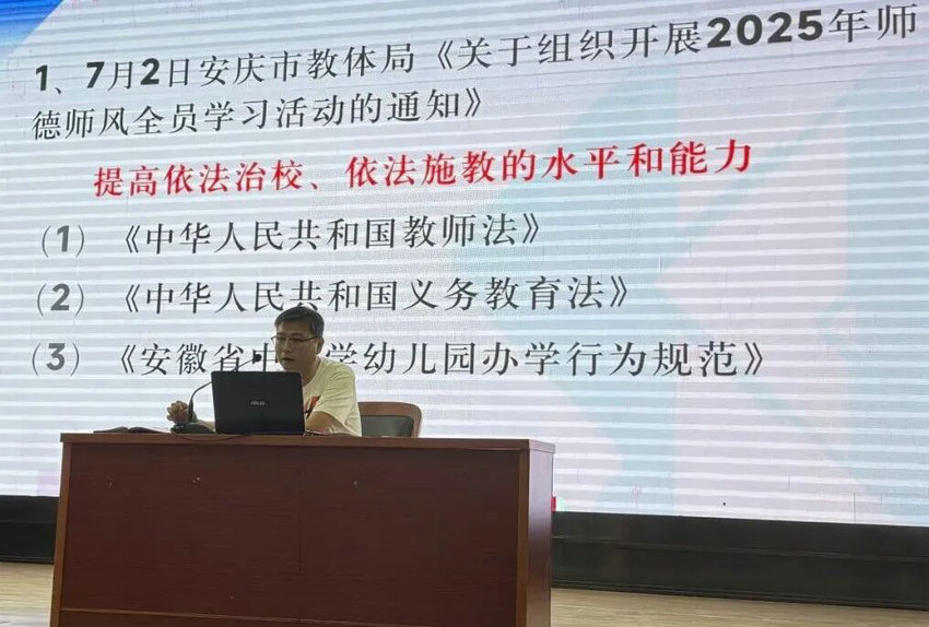小学部赵新龙主任结合7月2日安庆市教体局《关于组织开展2025年师德师风全员学习活动的通知》,带领教师学习《中华人民共和国教师法》《中华人民共和国义务教育法》《安徽省中小学幼儿园办学行为规范》,强调提升依法治校、依法施教水平,要求教师严守师德底线,以法治思维与人文关怀赋能教育教学。
