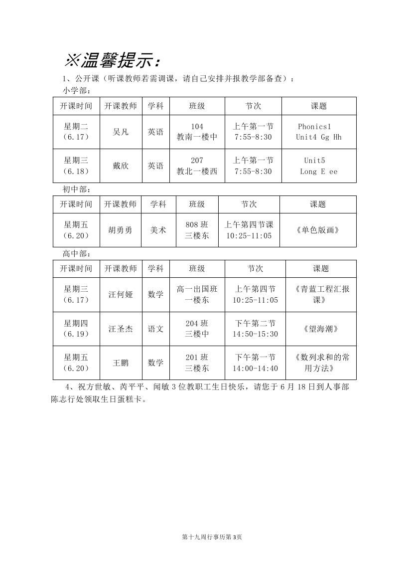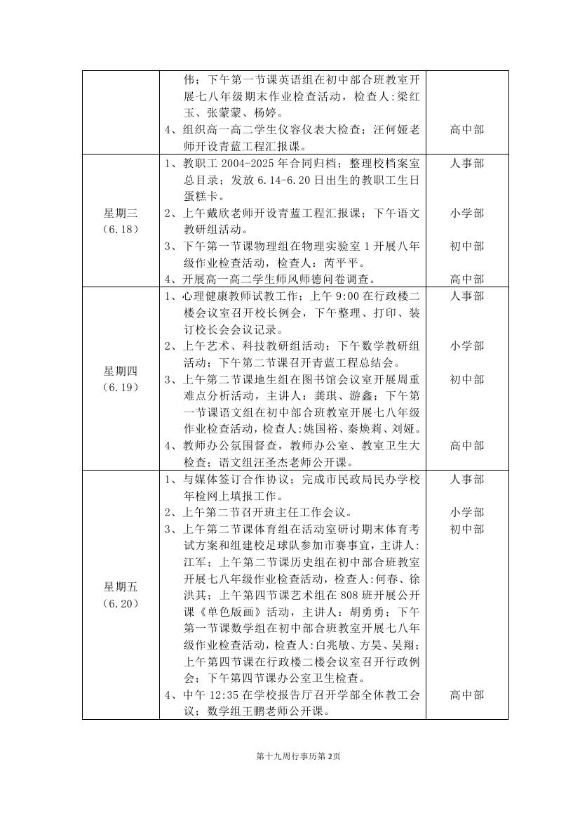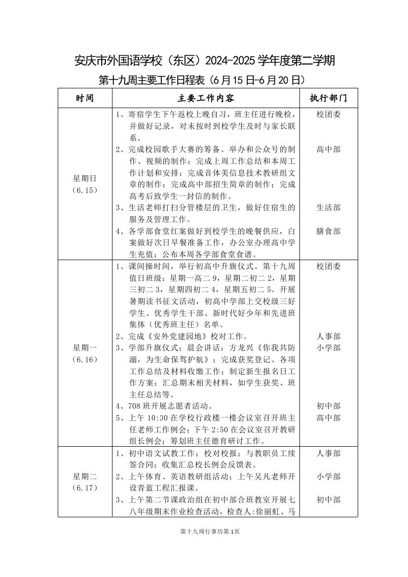 2024-2025学年度第二学期第十九周行事历(东区)