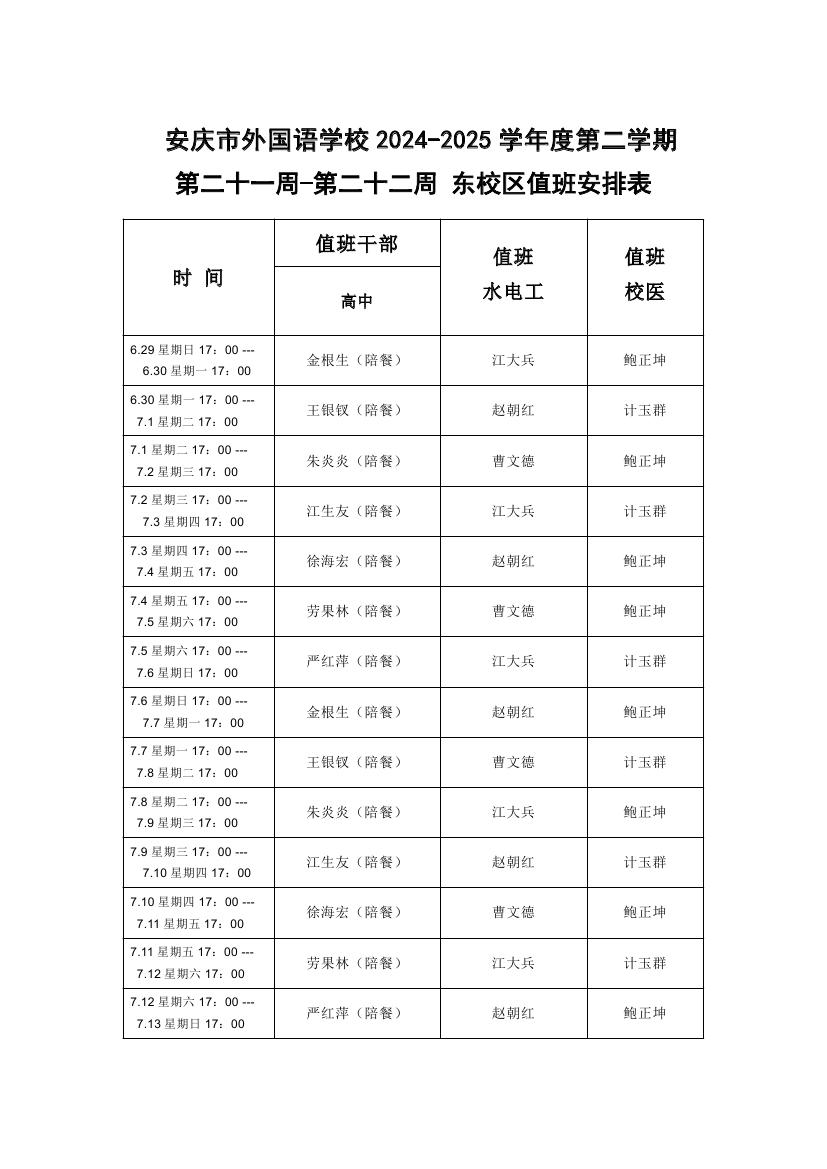 2024-2025学年度第二学期第二十一周-第二十二周东区干部值班表