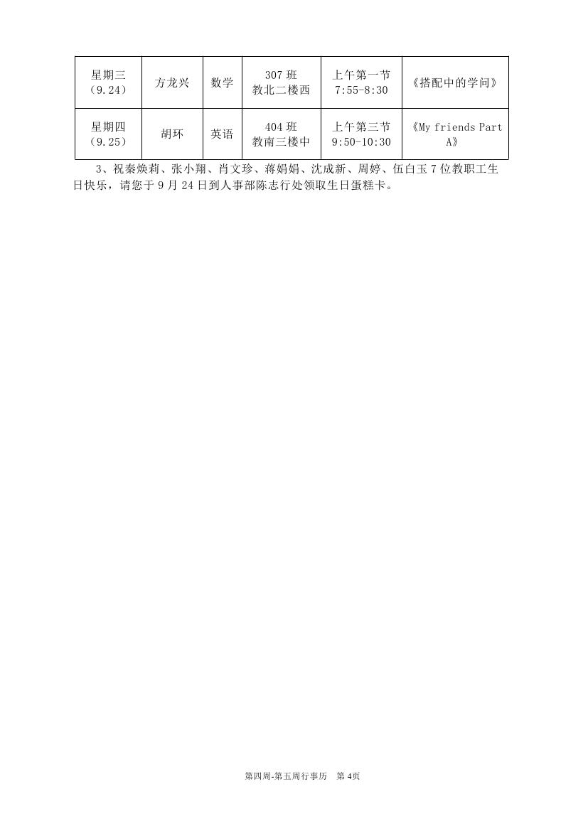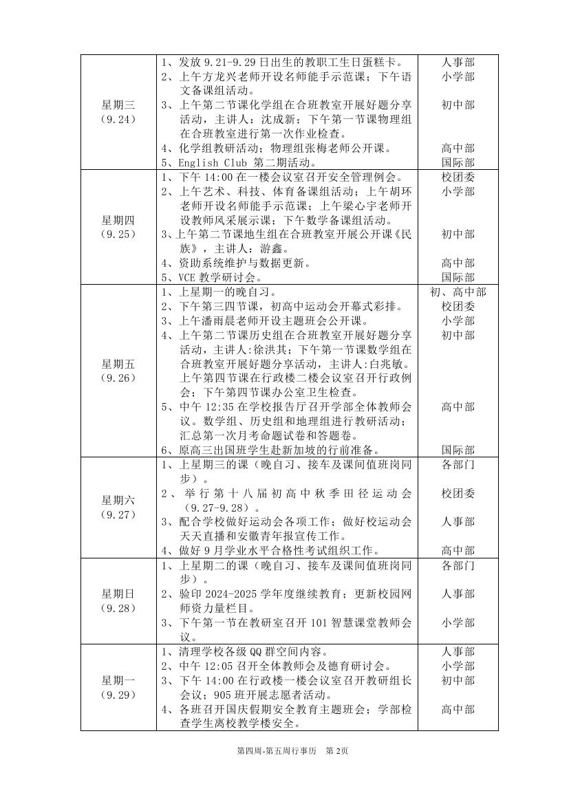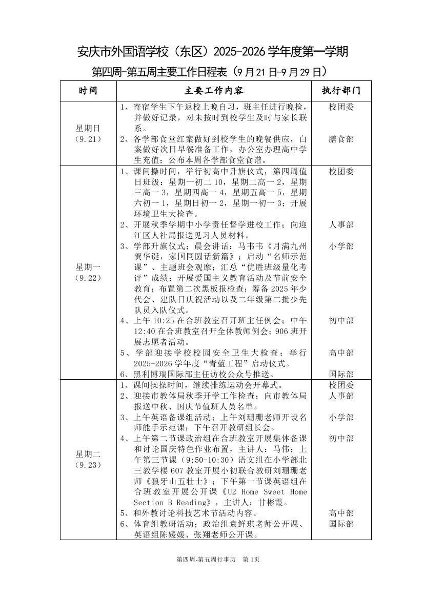 2025-2026学年度第一学期第四周-第五周行事历(东区)
