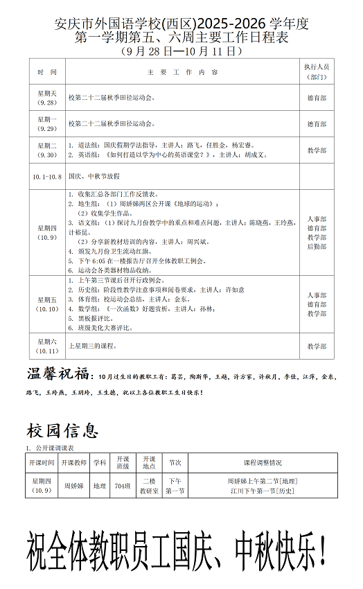 2025-2026学年度第一学期第五、六周行事历(西区)